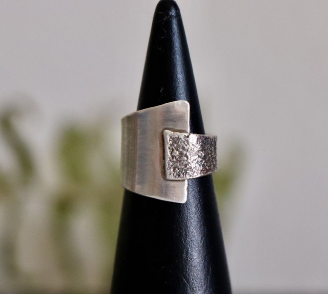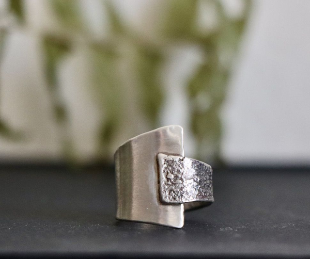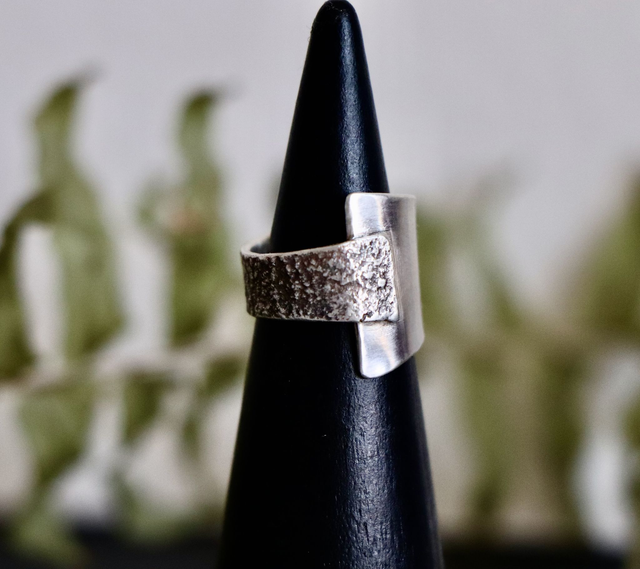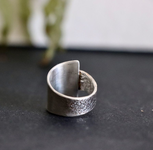 La bague Duelle est une pièce unique façonnée à la main dans mon atelier du Vaucluse. Son design repose sur une bande d’argent 925 asymétrique qui s’enroule avec fluidité autour du doigt. Une extrémité lisse, douce et satinée, dialogue avec l’autre extrémité réticulée, texturée comme une matière brute.