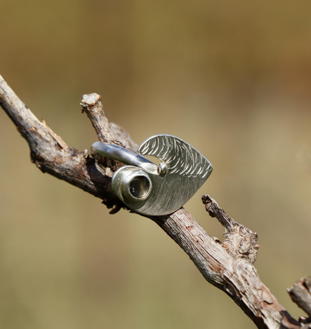 Une pierre naturelle sombre vient ponctuer la surface, comme une goutte déposée par la pluie, tandis qu’une bille d’argent au creux de la forme ajoute une touche de lumière.