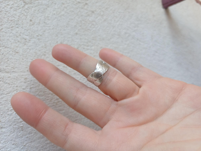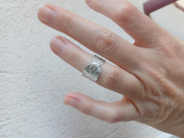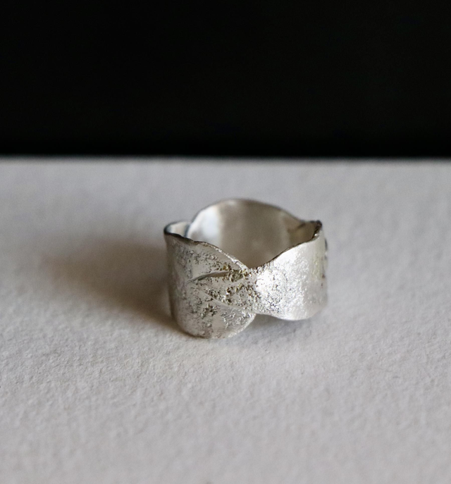 Bague née du feu : trois pétales d’argent façonnés au chalumeau, soudés les uns aux autres pour former une couronne irrégulière, délicatement texturée par réticulation.