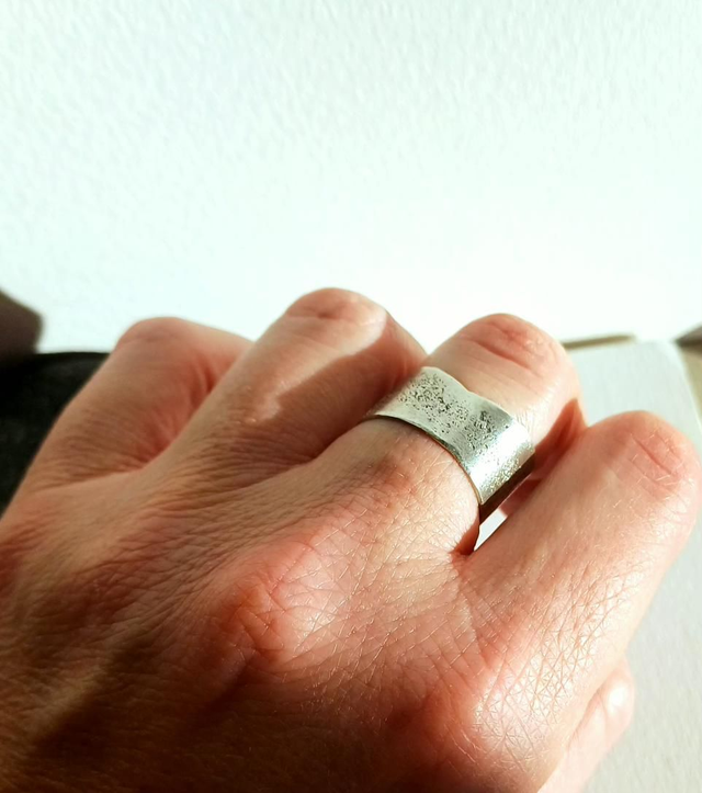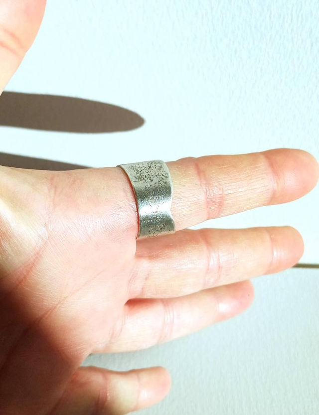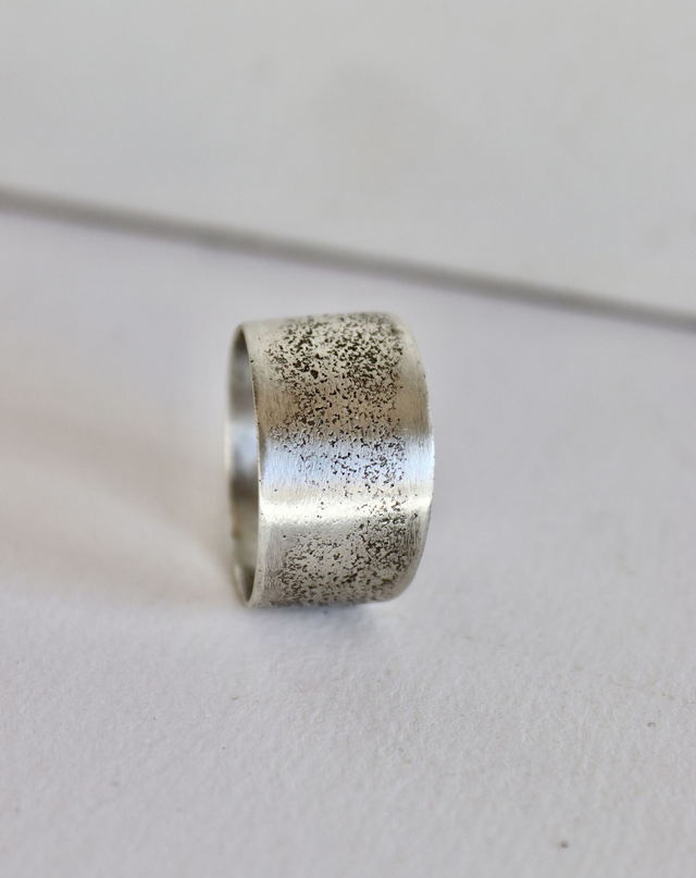 Façonnée entièrement à la main dans mon atelier du Vaucluse, la bague Silice révèle une surface mate presque lisse, ponctuée d’un grain fin, comme un dépôt minéral.
