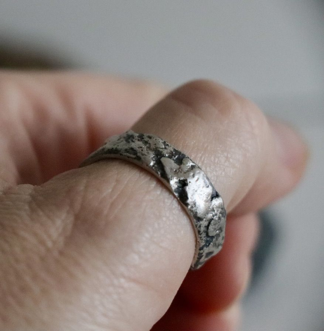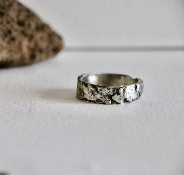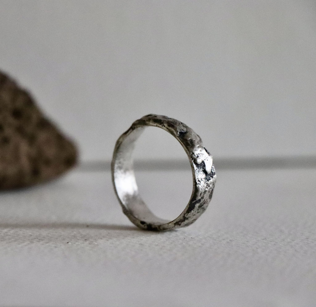 Façonnée entièrement à la main à l’établi, cette bague est née de la fusion directe de chutes d’argent sur une bande d’argent massif. Le métal est porté au feu jusqu’à se transformer, se contracter, se figer. Chaque relief est le résultat d’un geste précis et d’un lâcher-prise maîtrisé.