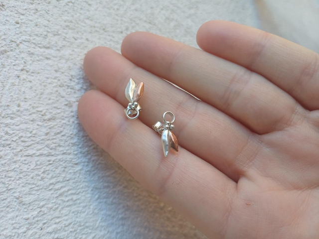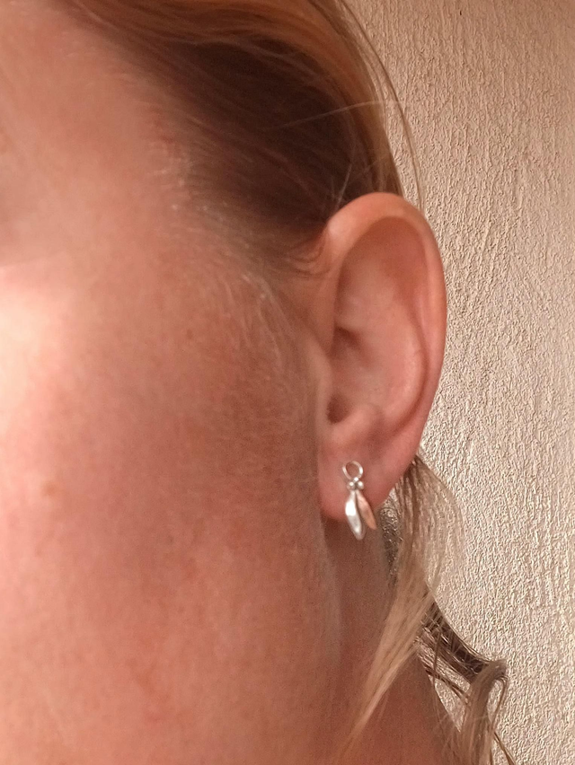 Chaque boucle est façonnée à la main à partir de plaques de métal ciselées et repoussées, évoquant deux feuilles d’arbre qui se rejoignent naturellement. Trois billes d’argent soudées en grappe et un petit cercle délicat créent le lien entre les deux matières, formant une composition organique et équilibrée.