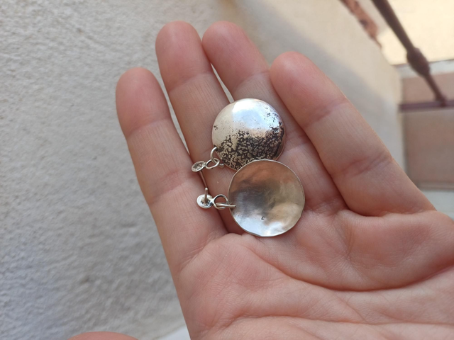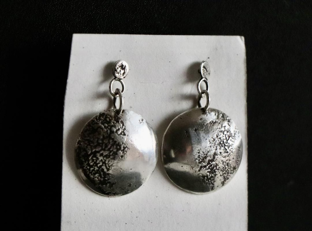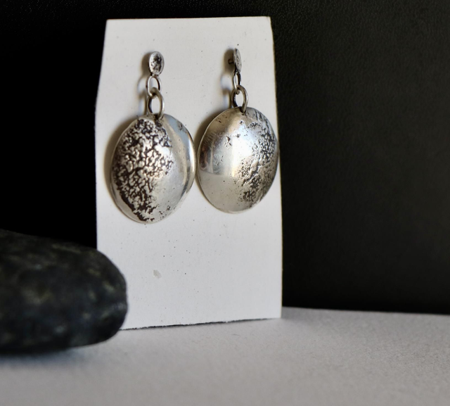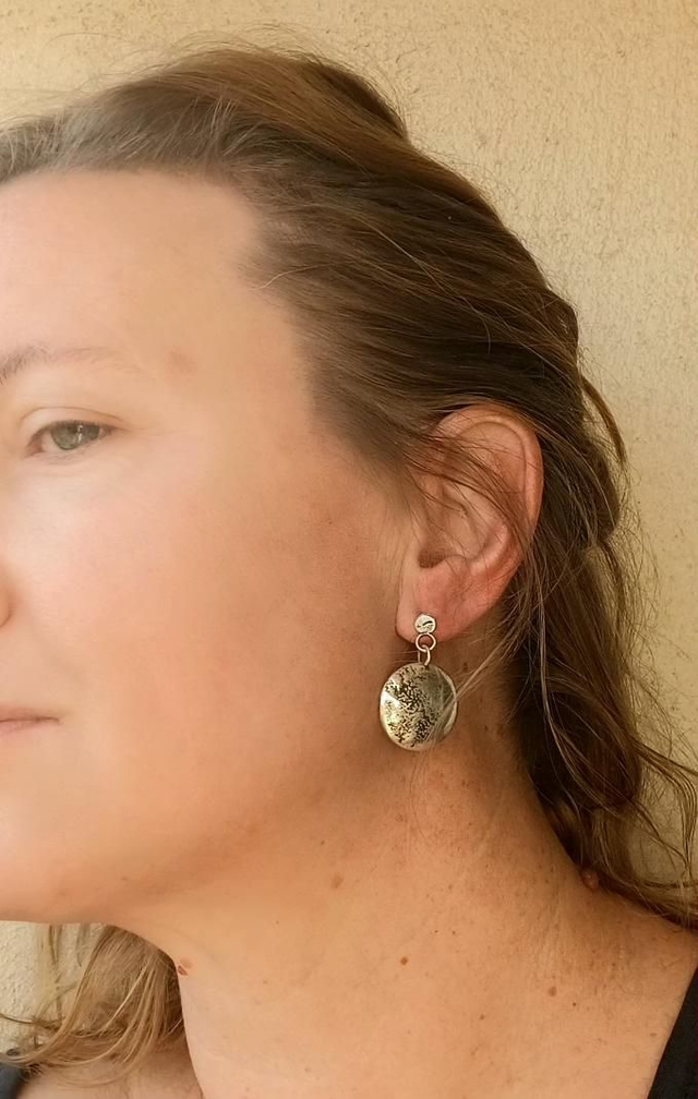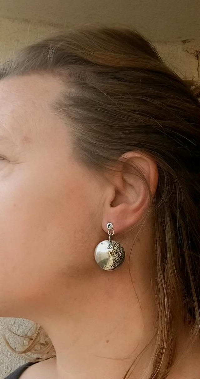 Suspendues à des puces légères, ces boucles se balancent délicatement et évoquent une lune, la Terre, ou une surface rocheuse sculptée par le temps.