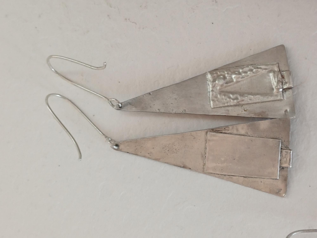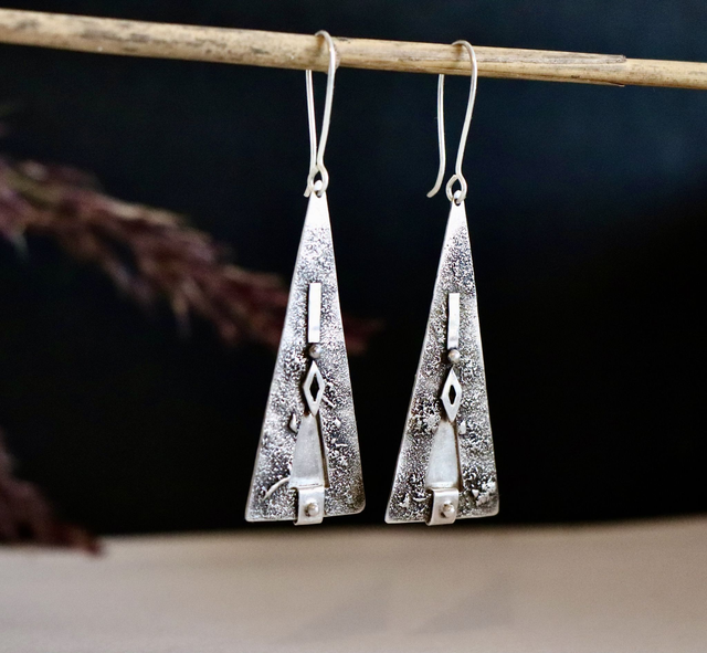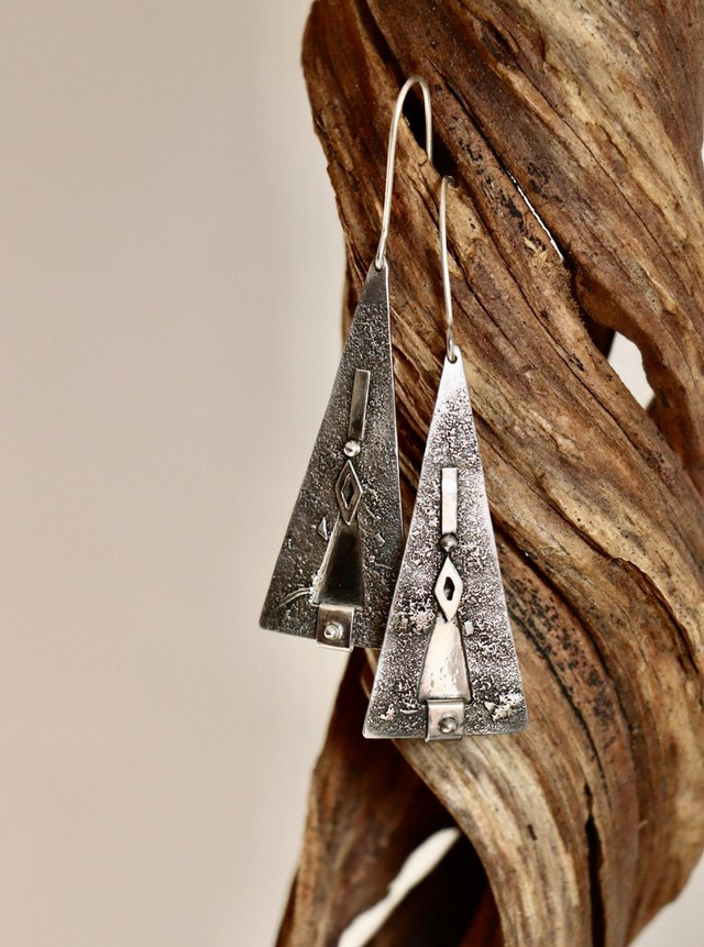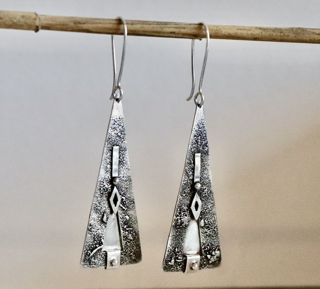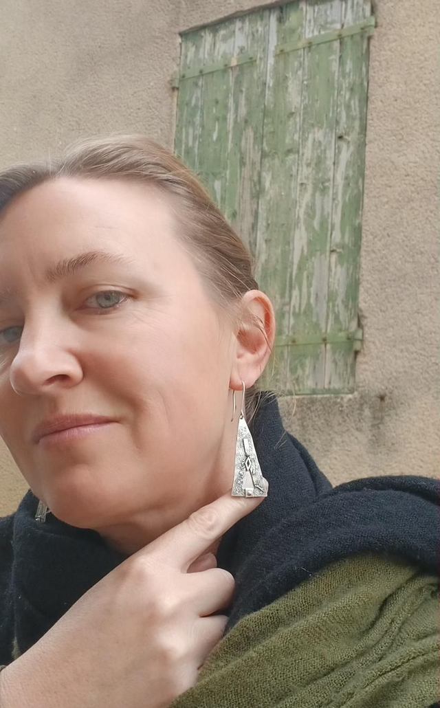 Les formes évoquent des motifs anciens, réinterprétés dans un bijou contemporain. De petits éléments lisses viennent ponctuer la matière brute, créant un équilibre sobre et affirmé.