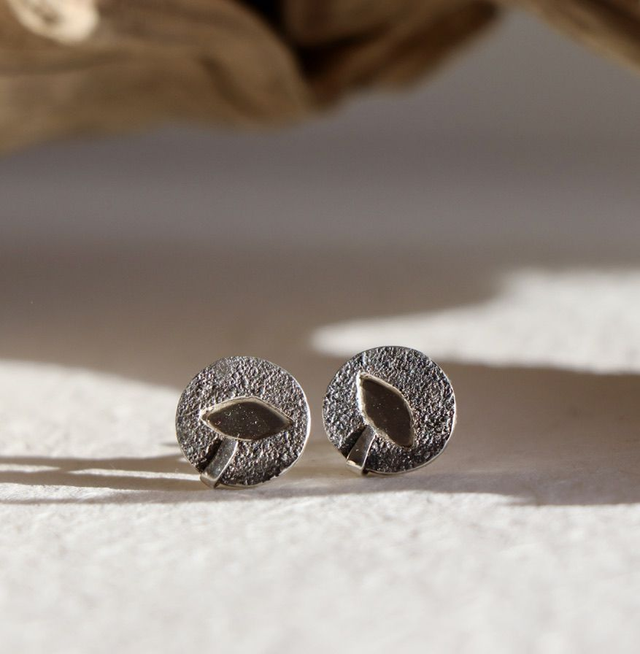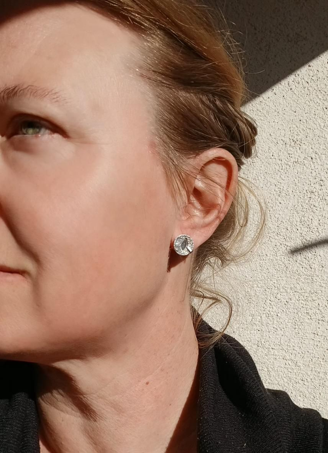 En leur cœur, une forme polie miroir capte et renvoie les reflets selon l’angle et le mouvement. Autour, l’argent est travaillé à la limaille, offrant une texture douce et organique qui contraste avec la brillance centrale.
