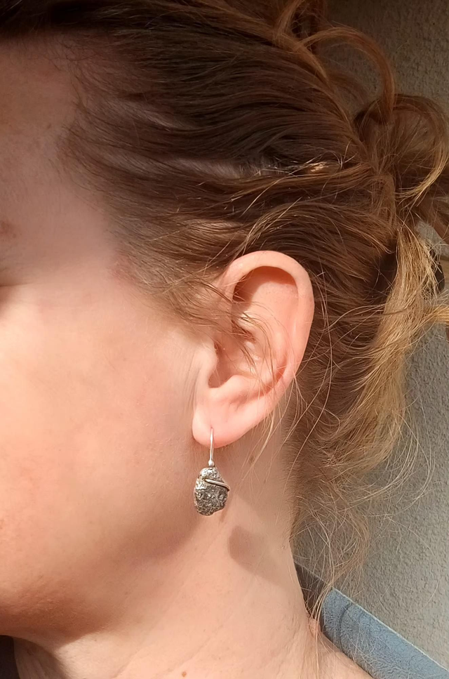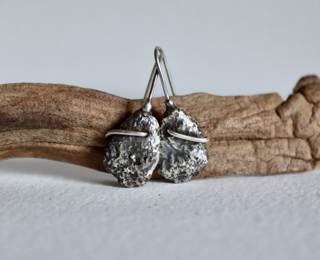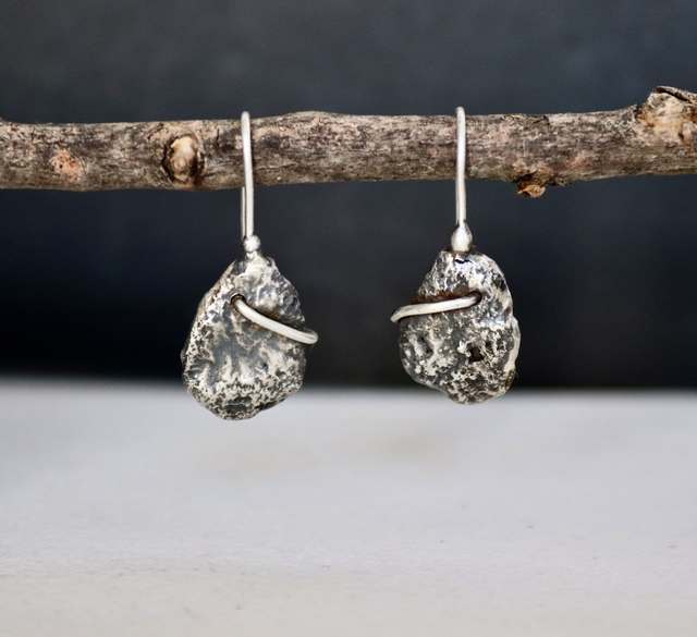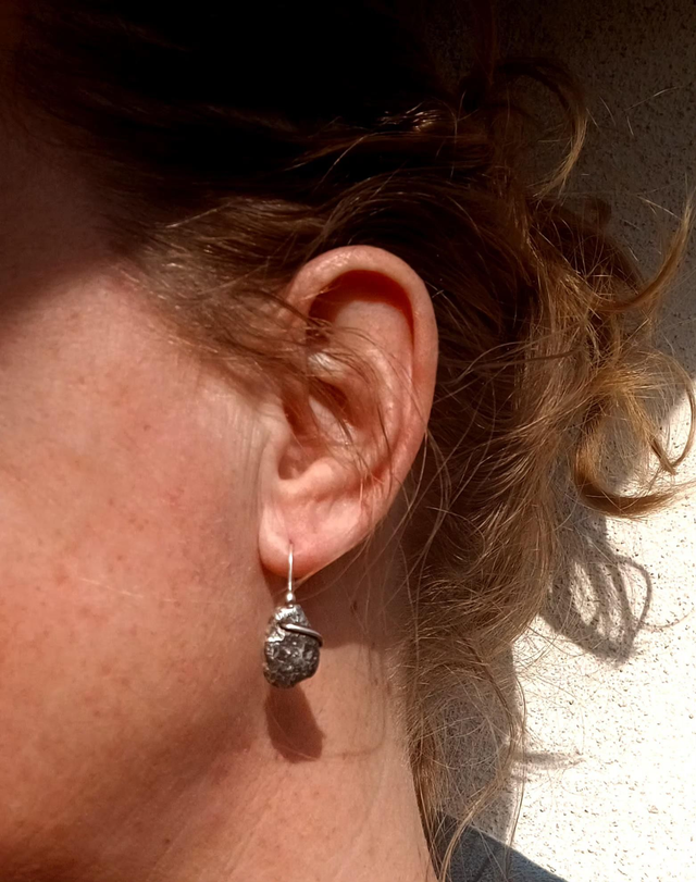 Issues de la collection Roc, ces boucles d’oreilles pendantes sont façonnées entièrement au chalumeau à partir d’argent recyclé. Leur texture brute, presque volcanique, évoque la pierre vivante, marquée par le feu et le geste.