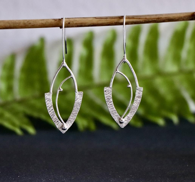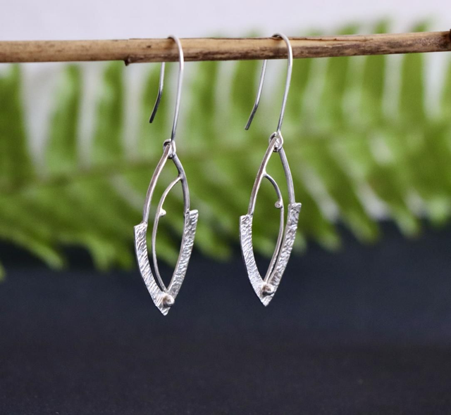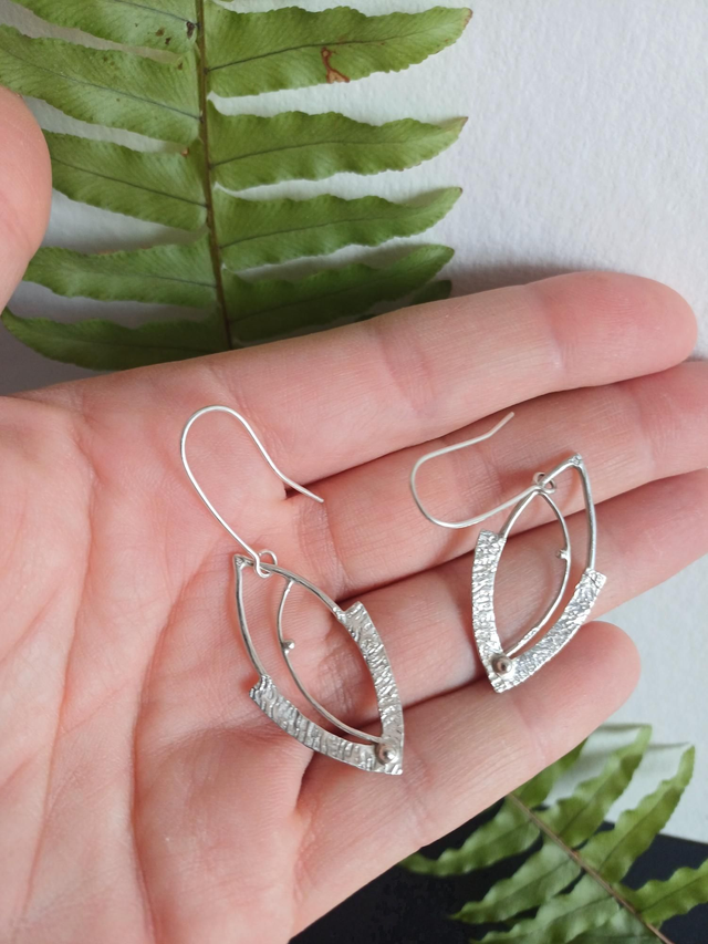 Paire de boucles d’oreilles en argent 925 façonnées à la main. Deux éléments effilés, soudés en suspension, dessinent une silhouette organique et graphique à la fois. La partie extérieure est marquée à l’aide d’un matoir, créant une texture brute par empreinte. Le contraste entre lignes lisses et reliefs martelés renforce le jeu de lumière.