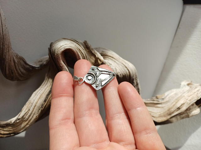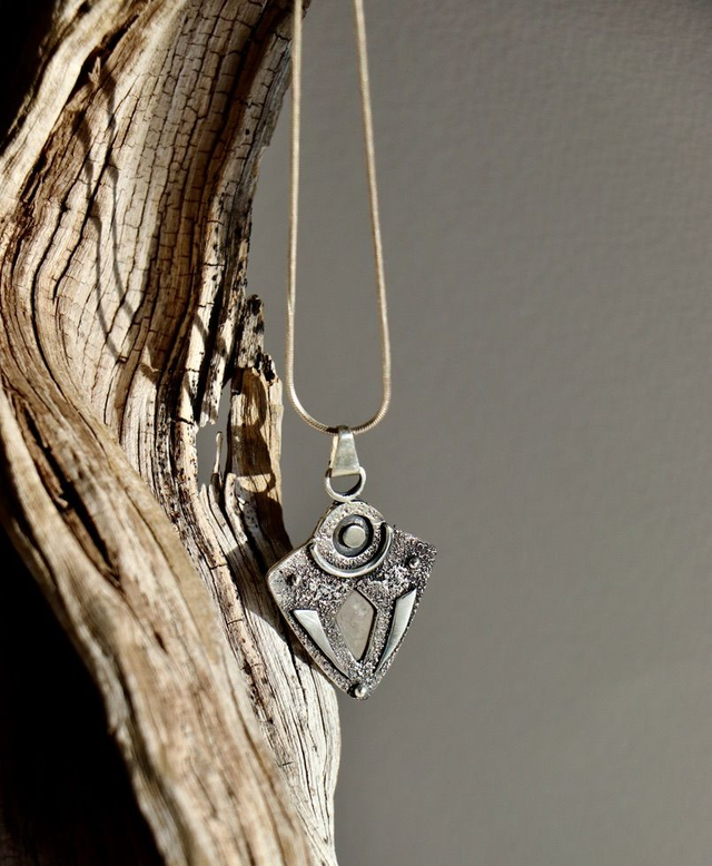 Ce pendentif m’évoque un talisman, presque un totem : un assemblage de formes et de volumes, où se rencontrent surfaces polies miroir, textures granuleuses et finitions oxydées ou argentées. Chaque contraste est pensé pour dialoguer avec la lumière et révéler des nuances différentes selon l’angle et le port.